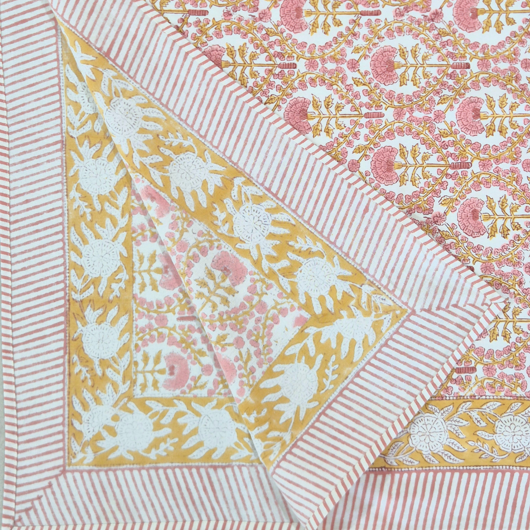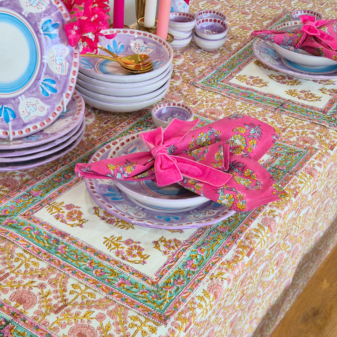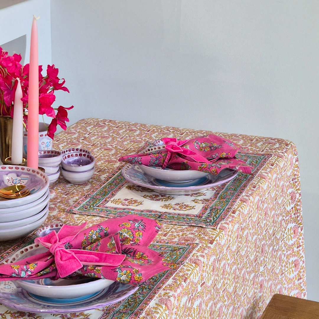 Our Rose Palace range features a matching tablecloth, napkin, and placemat, each block‑printed by hand in India. A timeless set that brings warmth and beauty to any home.