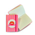 Bold, compact, and beautifully considered. This A6 notebook features 80 sheets of smooth 80gsm lined paper wrapped in a striking cover design that blends graphic clarity with artistic depth. The Bisou motif—centered around stylized puckered red lips and vertical red/pink stripes—offers a fresh take on visual storytelling, making this notebook as expressive as the ideas it holds.