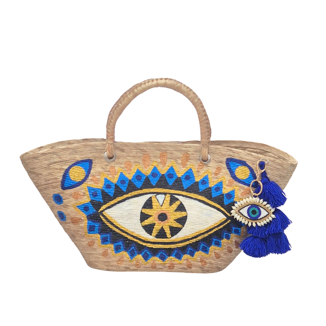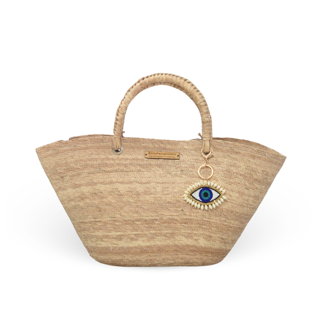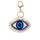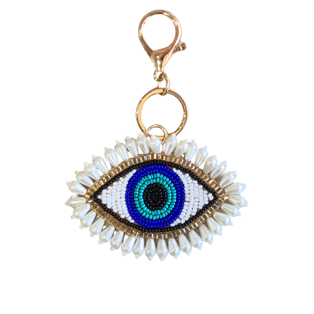 THE Evil Eye accessory perfect as a bag charm or as a key ring. Graphic, bold, and beautifully made. This charm reimagines the classic evil eye motif with clean lines and tactile beadwork. The palette--white, black, blue, and green--feels fresh and versatile. A statement detail that elevates any bag or key set.