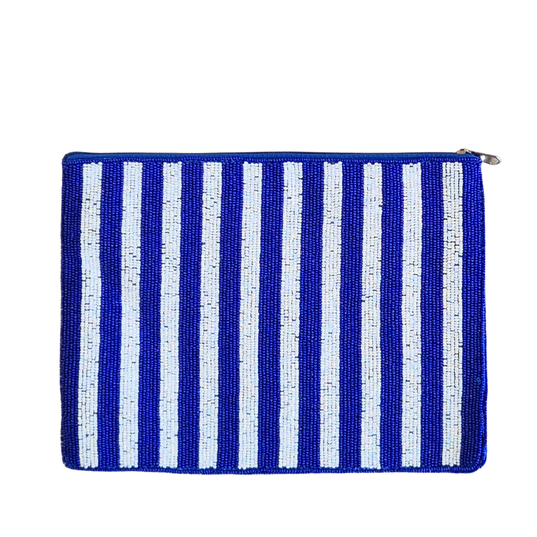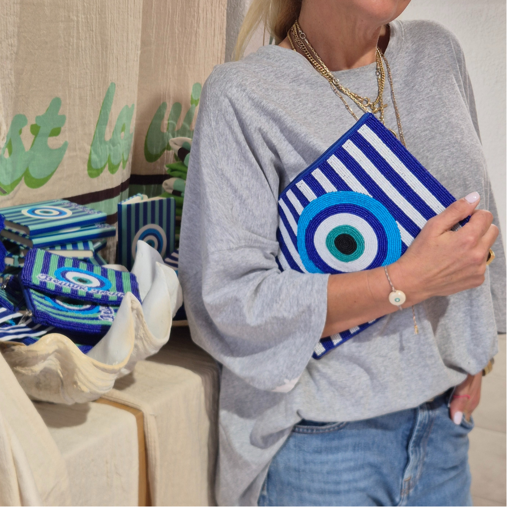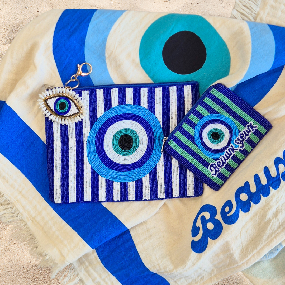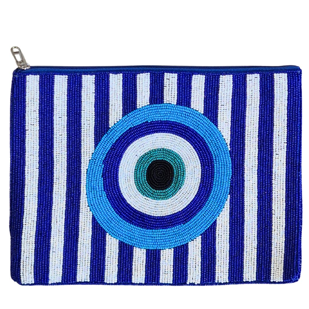 A classic motif, reimagined. This hand-beaded clutch features a bold evil eye centerpiece, a traditional symbol recast in a fresh, graphic palette of blues, green, and black. Set against vertical stripes in ocean blue and white, the design feels both nostalgic and modern, like a vintage talisman gone pop-art. The rectangular silhouette and zip-top closure make it perfect for stashing essentials, while the intricate beadwork adds texture and charm. Carry it solo for statement impact or tuck it into a larger tote as a practical pouch for your daily essentials.
