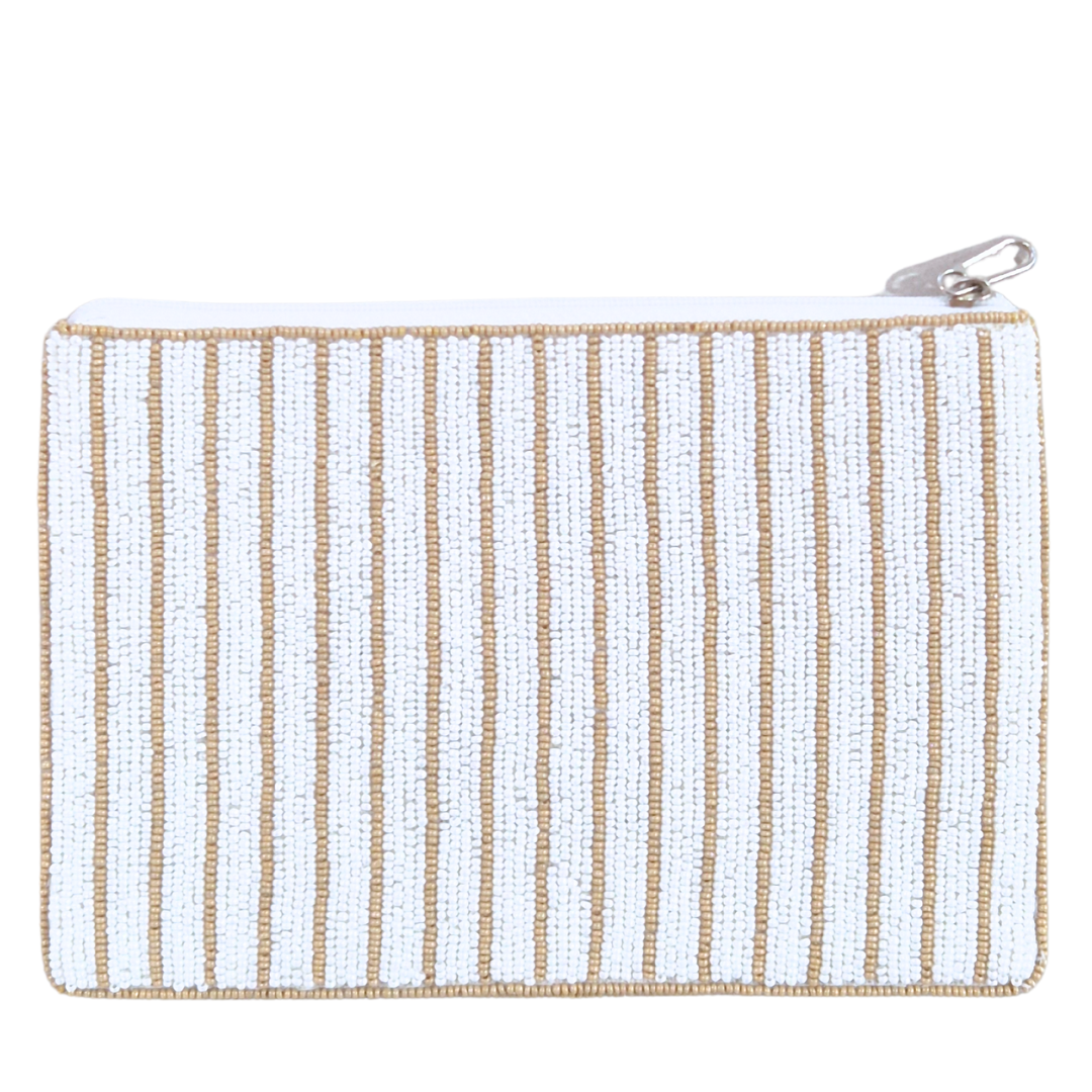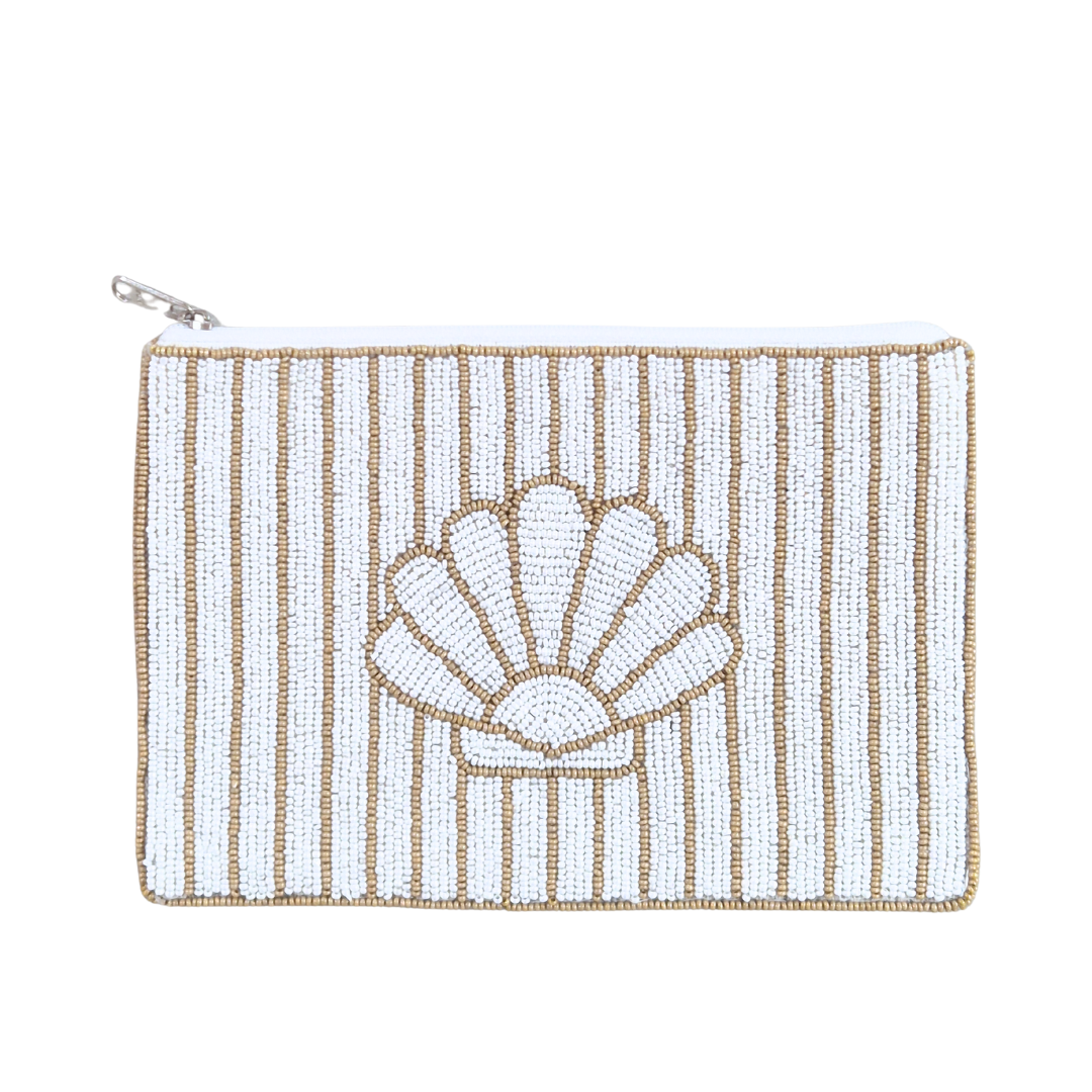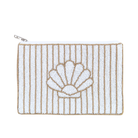 A charming companion for sun-drenched days and balmy nights, this striped beaded pouch blends coastal elegance with everyday practicality. Featuring hand-sewn beads in soft beige and white tones, its design reveals a delicate clamshell motif—an ode to the timeless allure of the French Riviera.