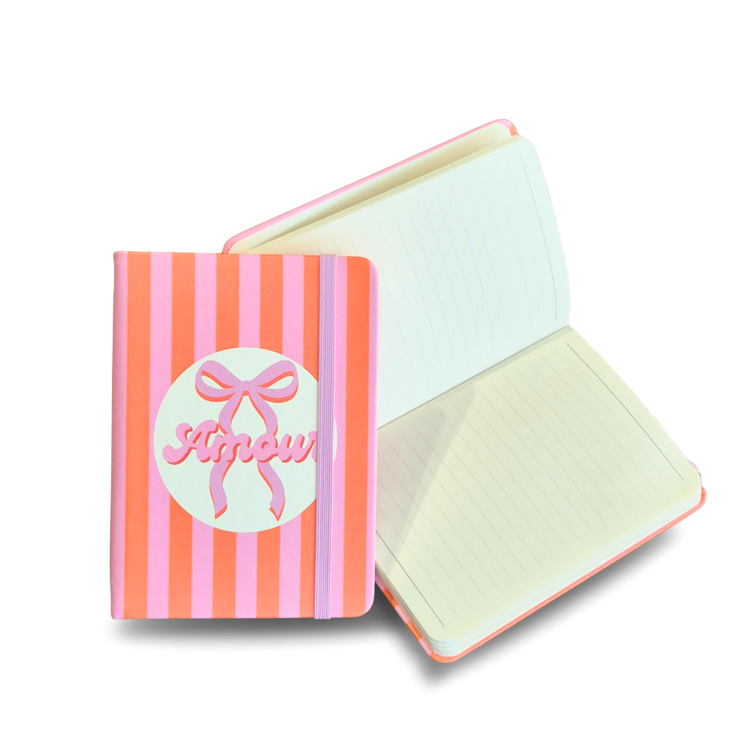 Bold, compact, and beautifully considered. This A6 notebook features 80 sheets of smooth 80gsm lined paper wrapped in a striking cover design that blends graphic clarity with artistic depth. The Amour motif—centered around a stylized bow knot and vertical coral/pink stripes—offers a fresh take on visual storytelling, making this notebook as expressive as the ideas it holds.
