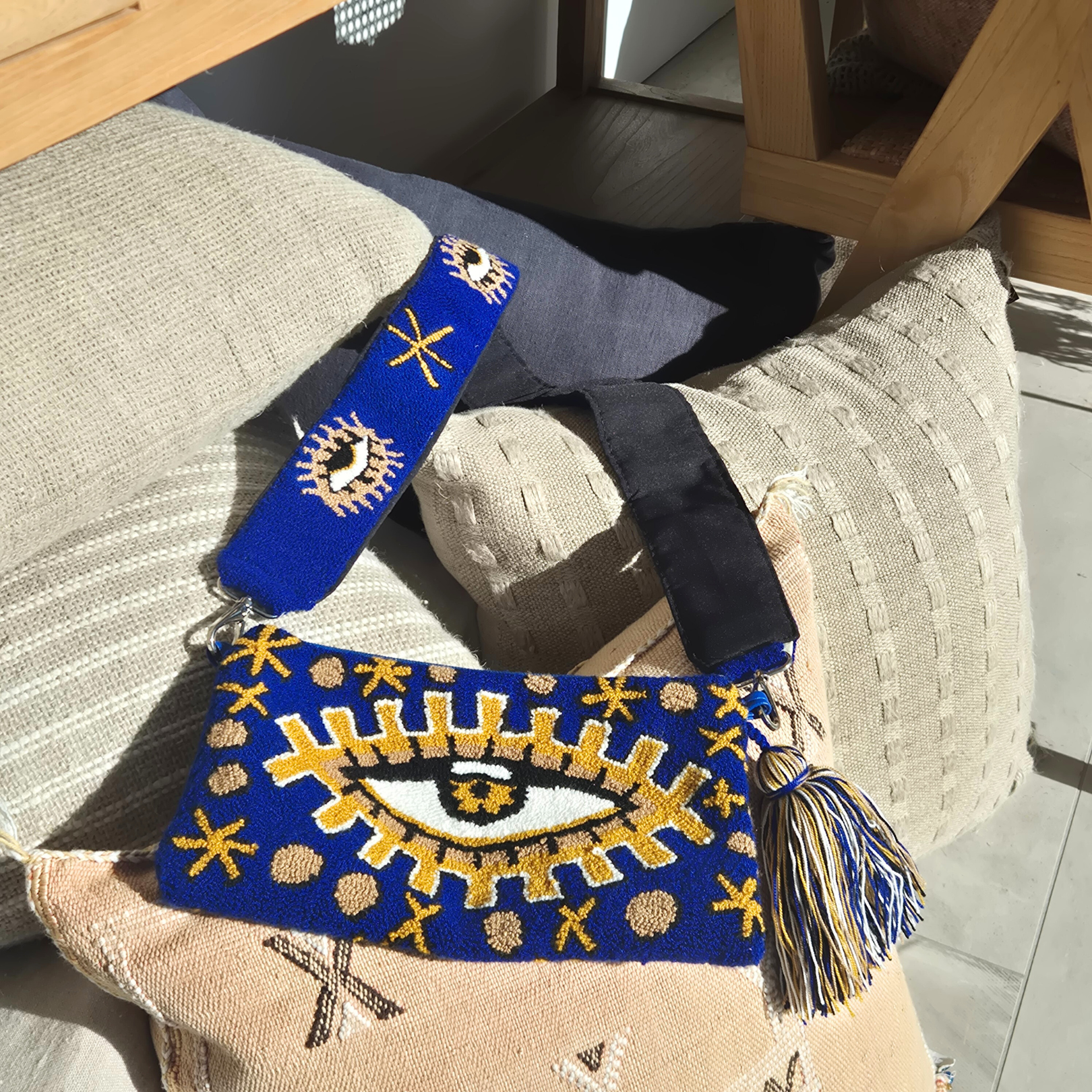 Meticulously hand-tufted by skilled artisans in Mexico, this vibrant blue cross-body bag features a stunning evil eye motif with rich texture and bold dimension. Its detachable strap offers versatile styling — wear it hands-free, or convert it into a clutch. Soft to the touch and visually striking, this bag merges handcrafted artistry with everyday functionality.