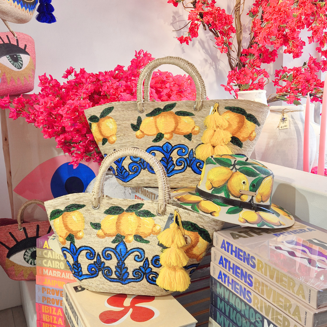 Our beach bags celebrate summer, warmth and the beauty of crystal-looking sparkling oceans. They are hand-painted and are both a stylish accessory and the perfect bag to grab when popping off to the beach, having a lunch out, strolling around the market or lazing by the pool. So chic, so versatile and they come in two great sizes. The medium is perfect for yourself or the large if you're carrying towels for your loved ones. All bags come adorned with pompoms. Never leave home without looking like the goddess you are!