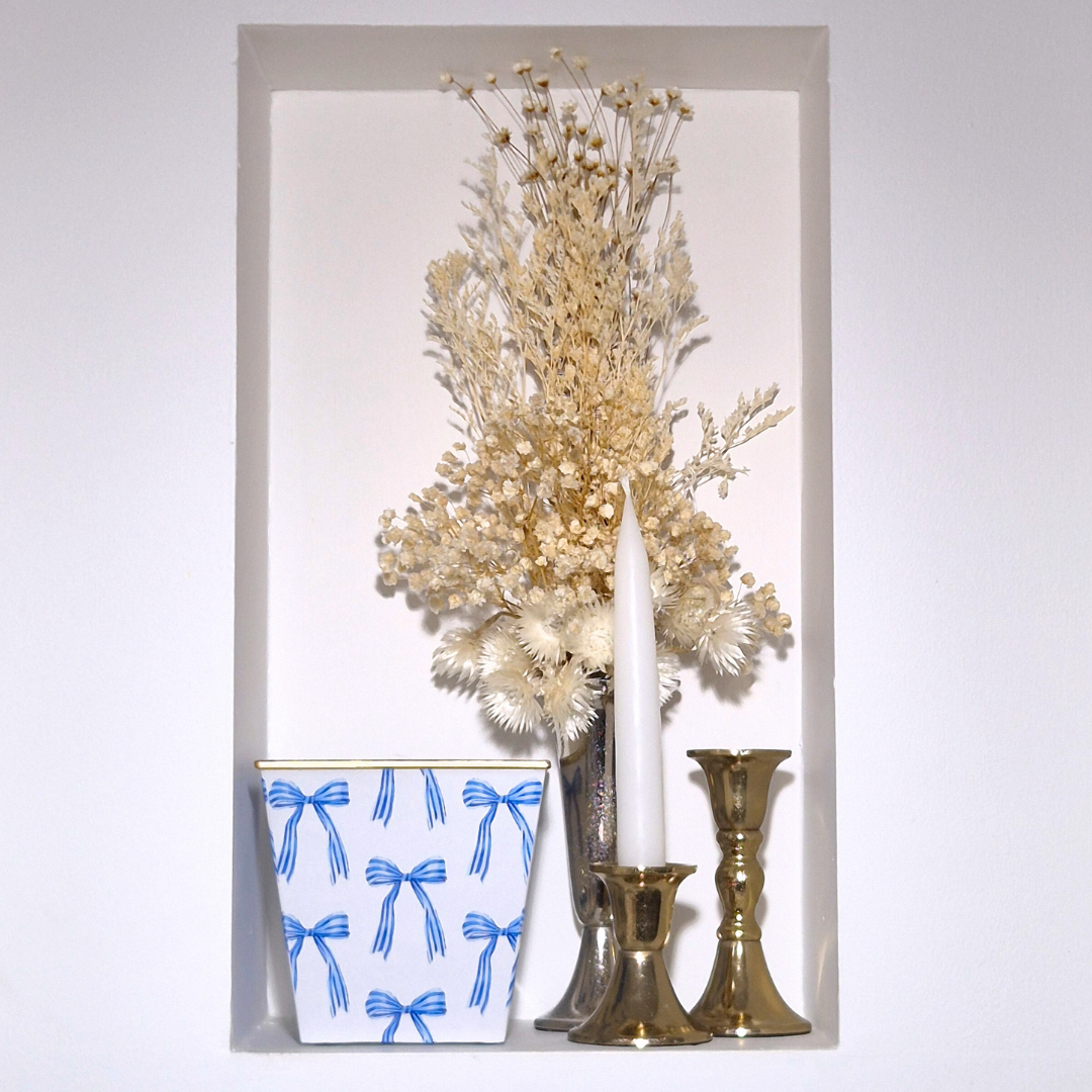 Handcrafted of composite material, wrapped in decorative paper, and finished with a burnished gold rim — four protective pads support its base. As an added bonus, once your candle is gone, reuse the beautiful container to hold plants and fresh flowers, or as a decorative object!