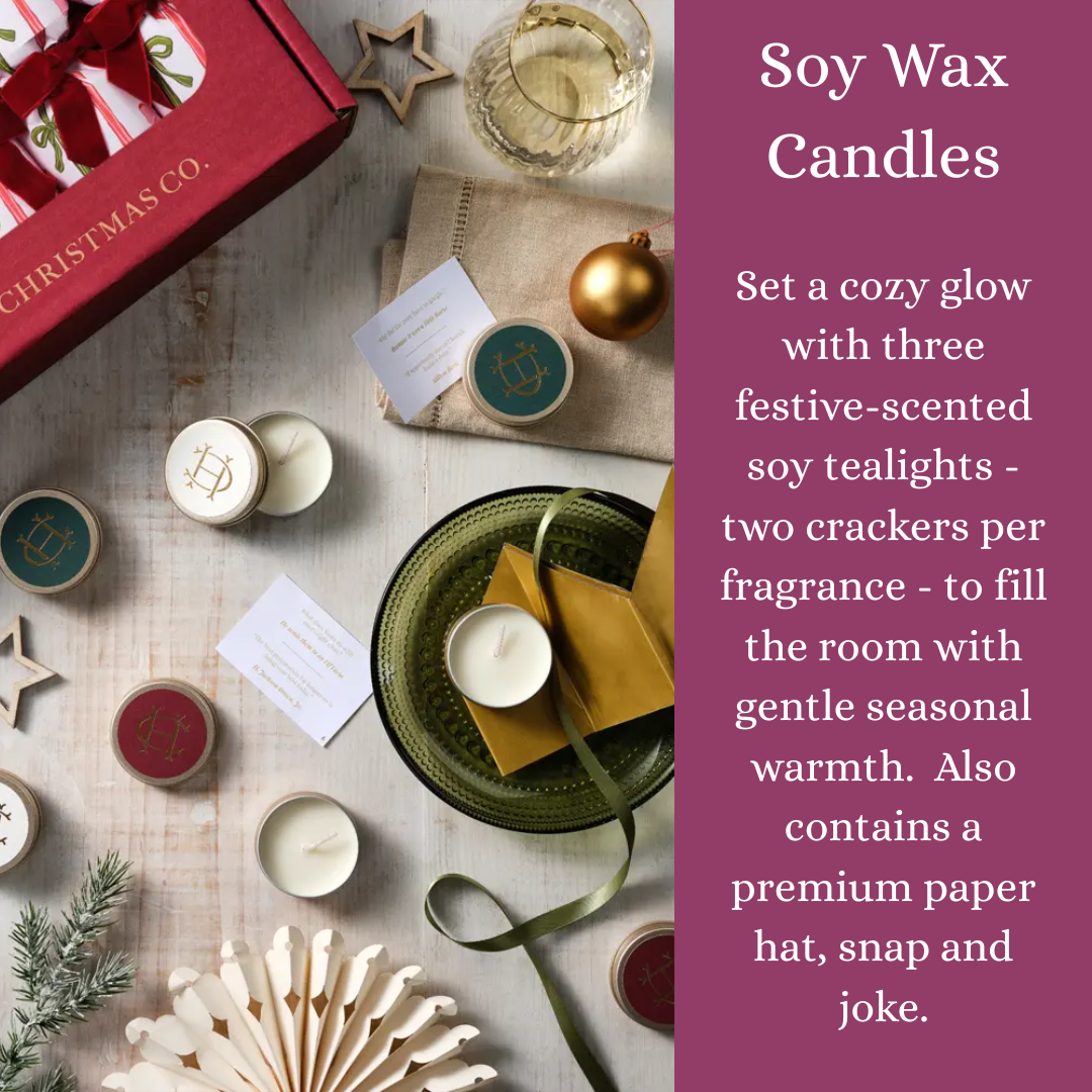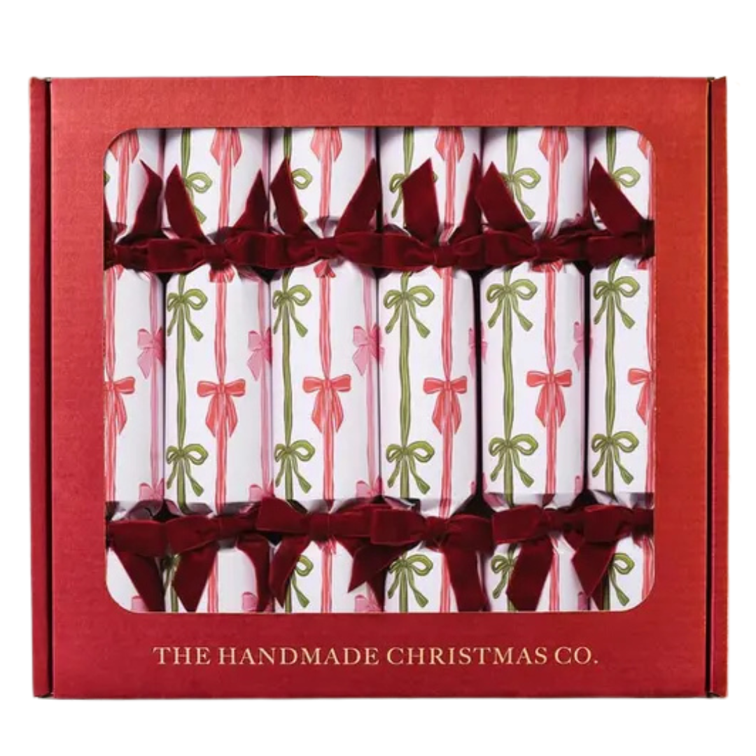 Add a playful pop of colour to your Christmas celebrations with this set of 6 handmade crackers, featuring a whimsical ribbon motif in festive red and green. The cheerful hand-drawn bows dance across crisp white paper, complemented beautifully by rich burgundy velvet ribbons for a charming yet contemporary finish. A joyful choice for a fun and festive table setting.