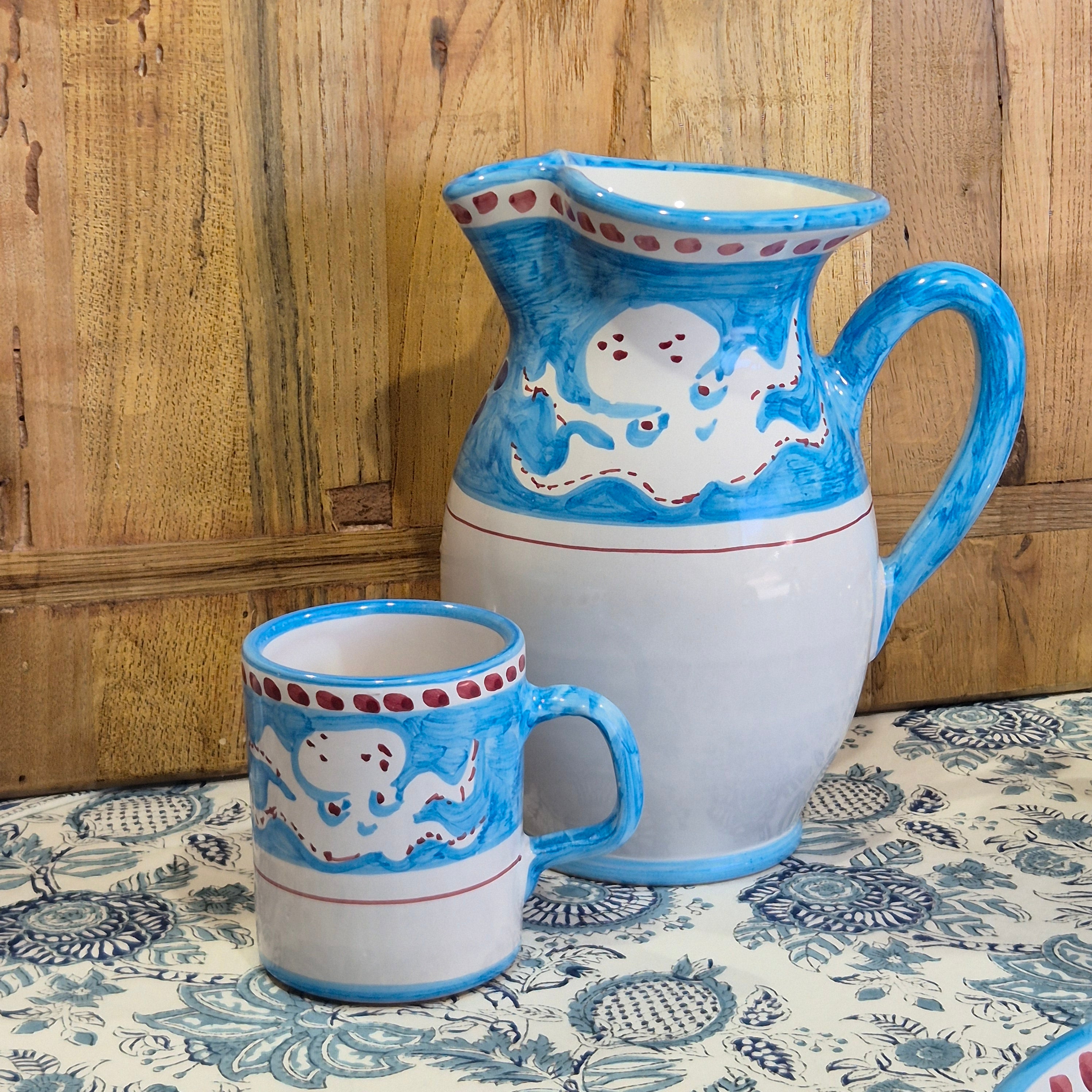 A hand-painted Italian jug featuring a blue palette with charming octopus motifs. Perfect for serving any beverage or displaying seasonal blooms, it brings a warm Mediterranean touch to everyday dining. Crafted with artisanal care in Italy.