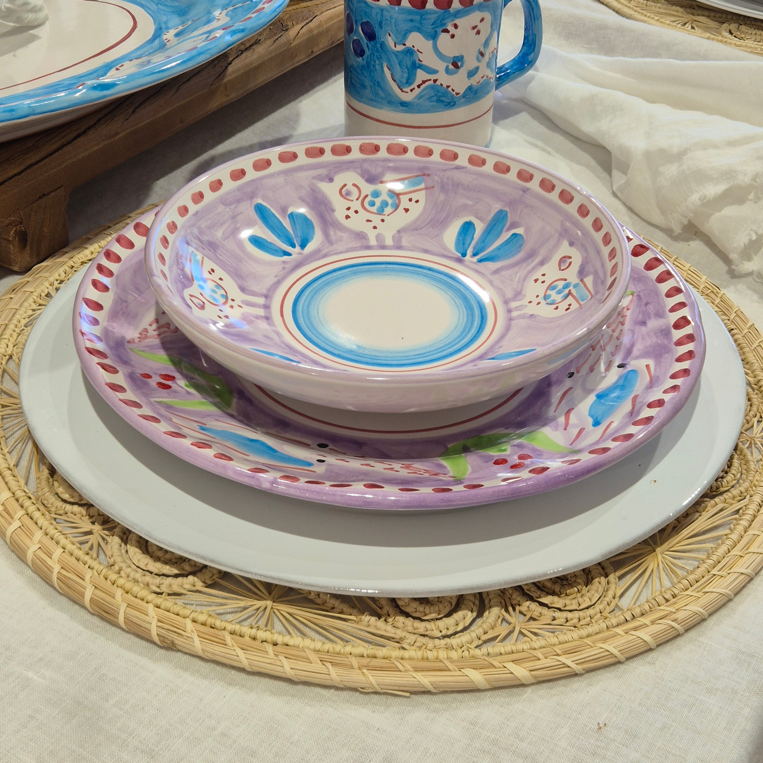 A charming hand-painted Italian pasta bowl featuring soft lilac tones, playful bird motifs, and vibrant blue accents. Perfect for pasta, salads, or generous servings, it brings a delicate Mediterranean touch to any table. Crafted in Italy with artisanal detail.