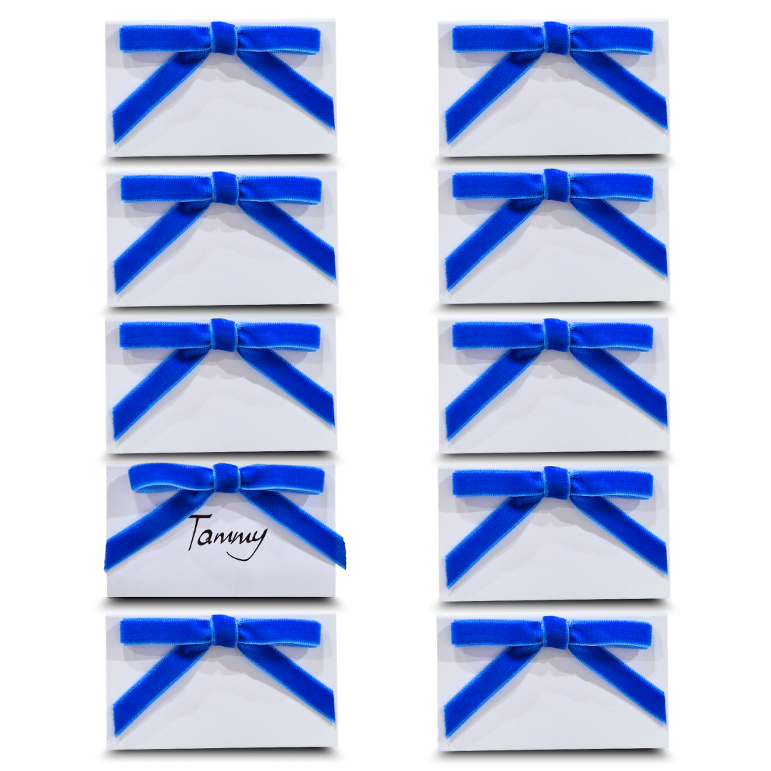 These name cards feature a plain white base designed for writing names, each accented with an electric blue velvet bow. Sold in sets of 10, they offer a stylish and elegant way to personalize your event seating arrangements.