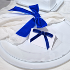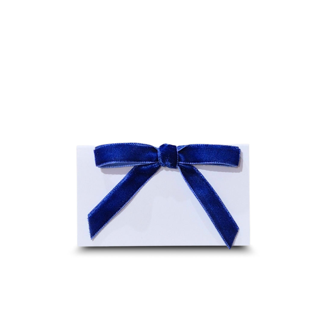 These name cards feature a striking blue velvet bow attached to plain white paper, providing a clean and elegant surface for writing guest names. Sold in sets of 10, they are ideal for adding a refined touch to any event or gathering.