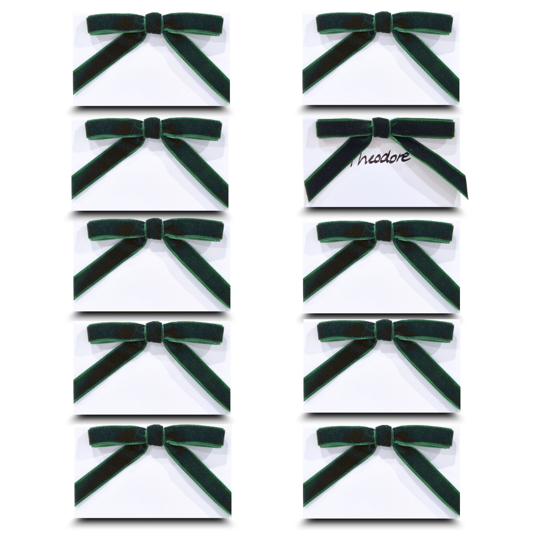 These name cards feature a plain white base designed for writing names, each accented with a green velvet bow. Sold in sets of 10, they offer a stylish and elegant way to personalize your event seating arrangements.