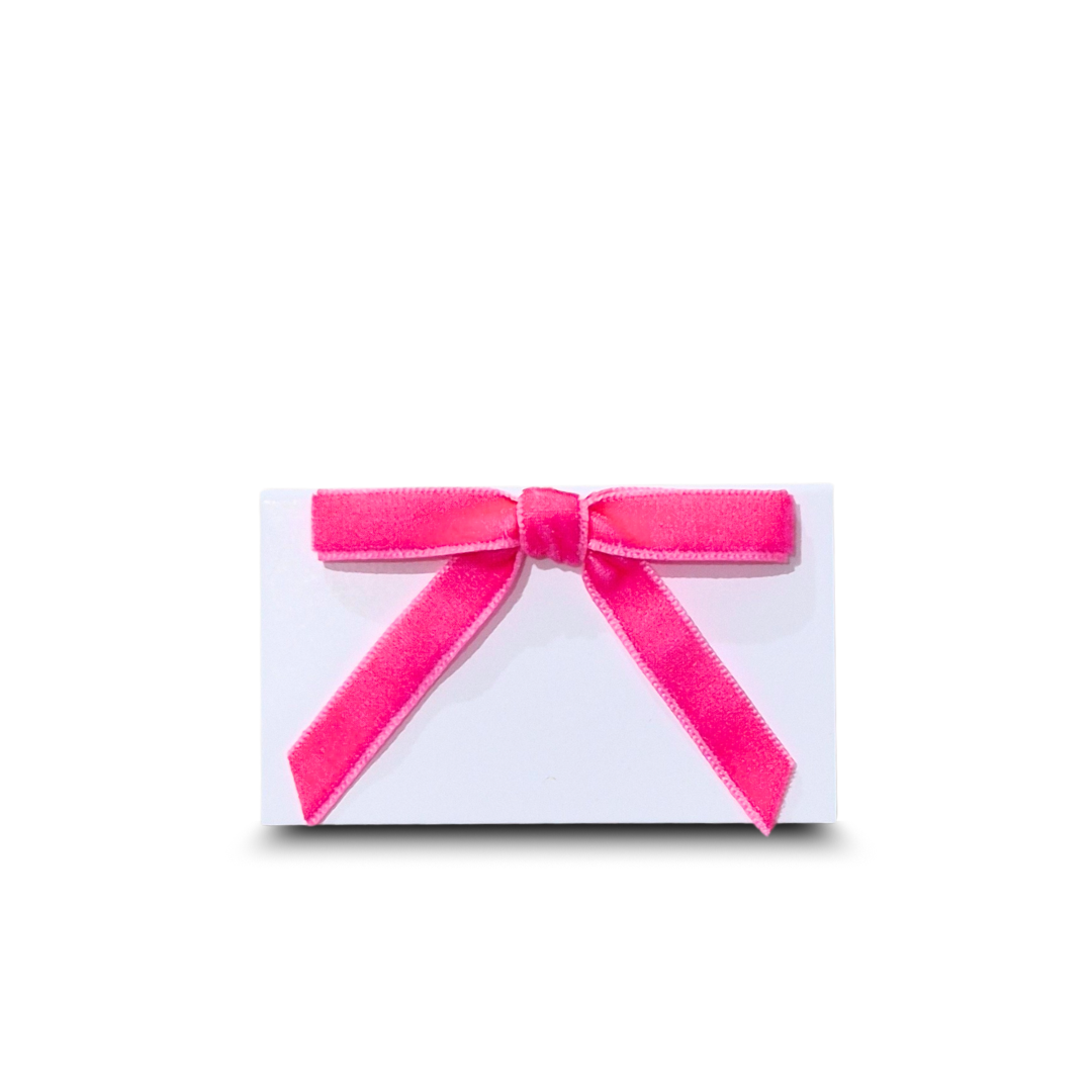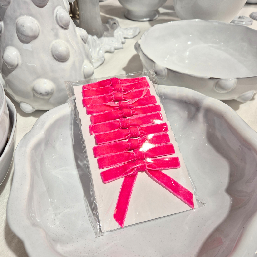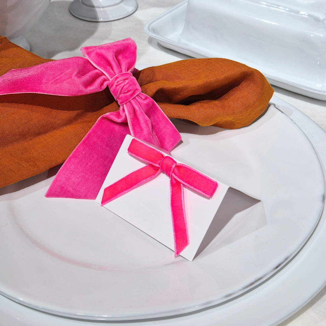 These name cards feature a plain white base designed for writing names, each accented with a vibrant hot pink velvet bow. Sold in sets of 10, they offer a stylish and elegant way to personalize your event seating arrangements.
