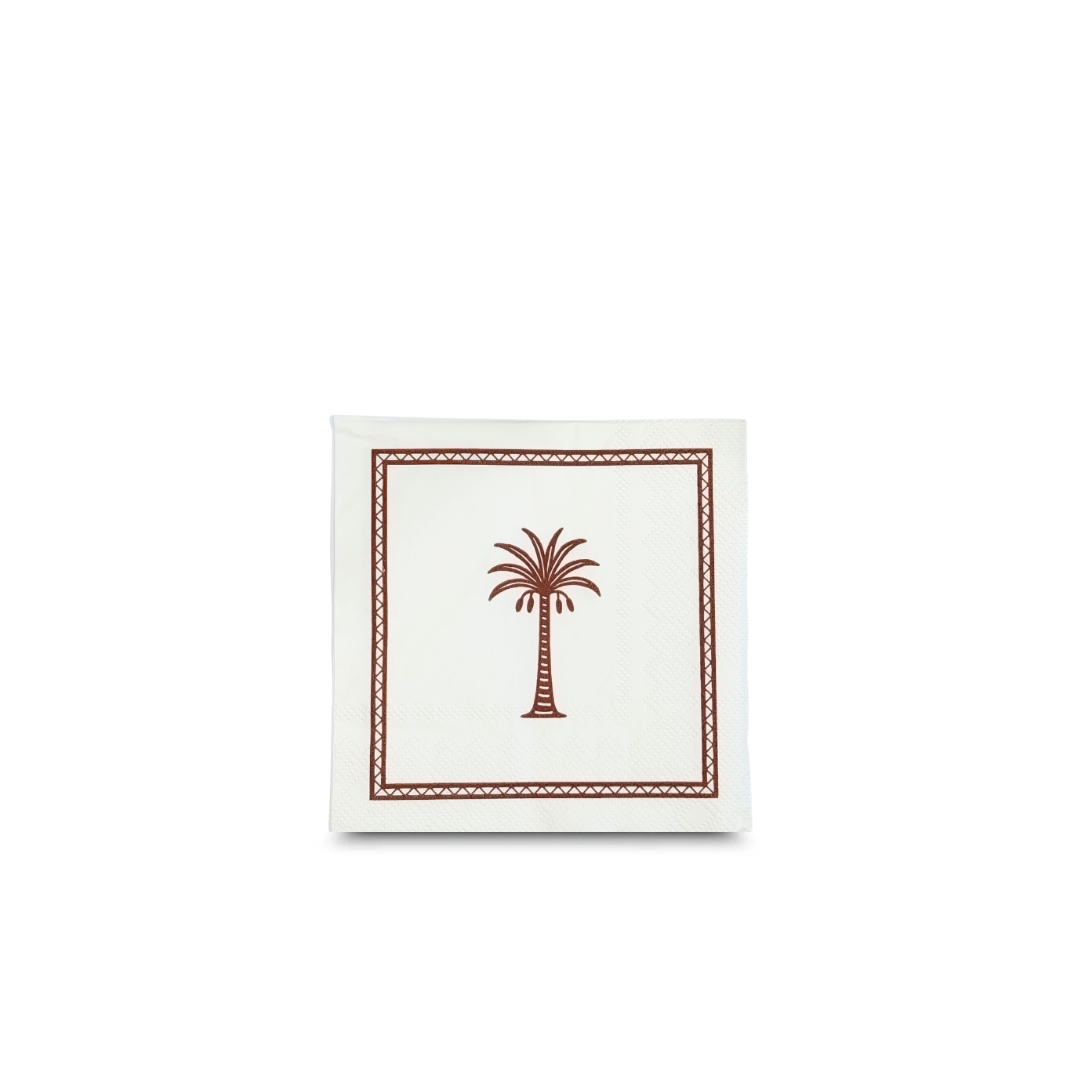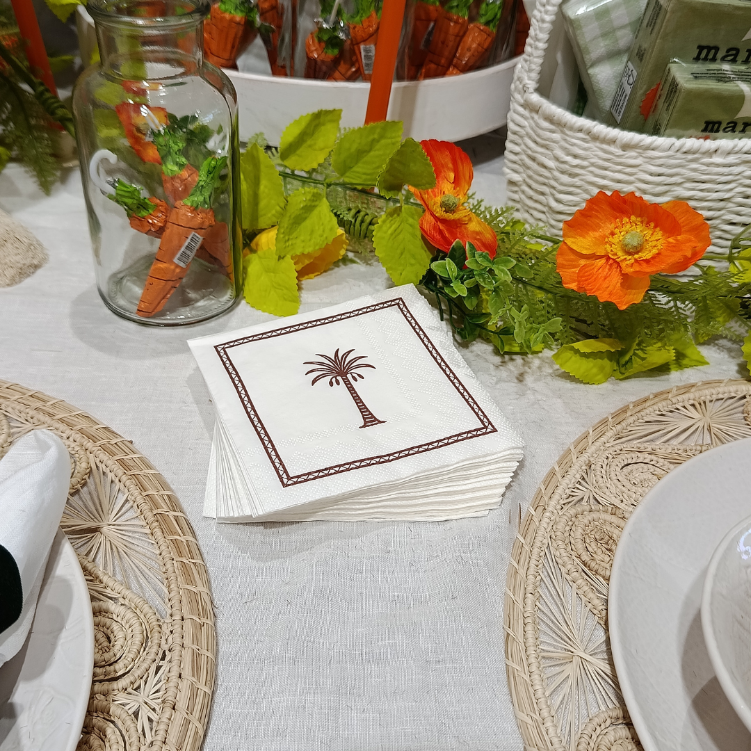Elevate your mealtime experience with our high-quality disposable cocktail napkins - perfect for everyday use, parties, picnics, and food service settings. Crafted from soft yet durable paper, featuring a brown palm tree illustration in a decorative geometric rim these napkins offer excellent absorbency and a clean, polished look that complements any table setting. Whether you're packing school lunches, hosting a casual gathering, our cocktail napkins provide a hygienic and convenient solution. Also available in a lunch and a guest size.