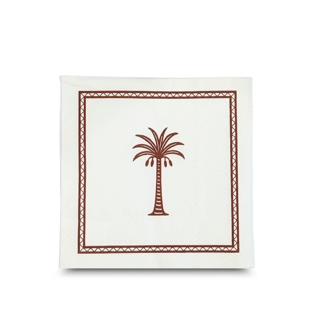 Elevate your mealtime experience with our high-quality disposable lunch napkins—perfect for everyday use, parties, picnics, and food service settings. Crafted from soft yet durable paper, featuring a brown palm tree illustration in a decorative geometric rim these napkins offer excellent absorbency and a clean, polished look that complements any table setting. Whether you're packing school lunches or hosting a casual gathering, our lunch napkins provide a hygienic and convenient solution. Also available in a coctail and a guest size.