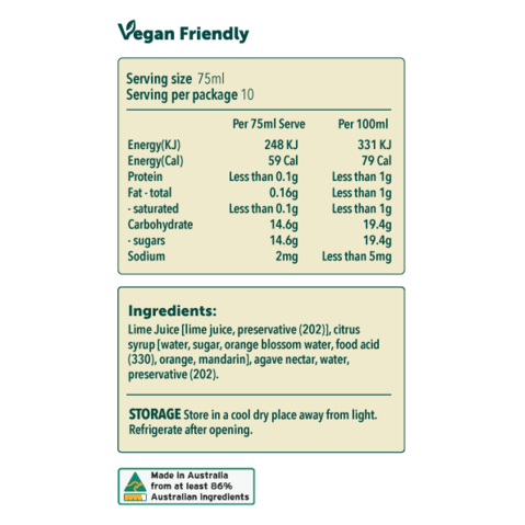 Lime Juice [lime juice, preservative (202)], citrus syrup [water, sugar, orange blossom water, food acid (330), orange, mandarin], agave nectar, water, preservative (202).