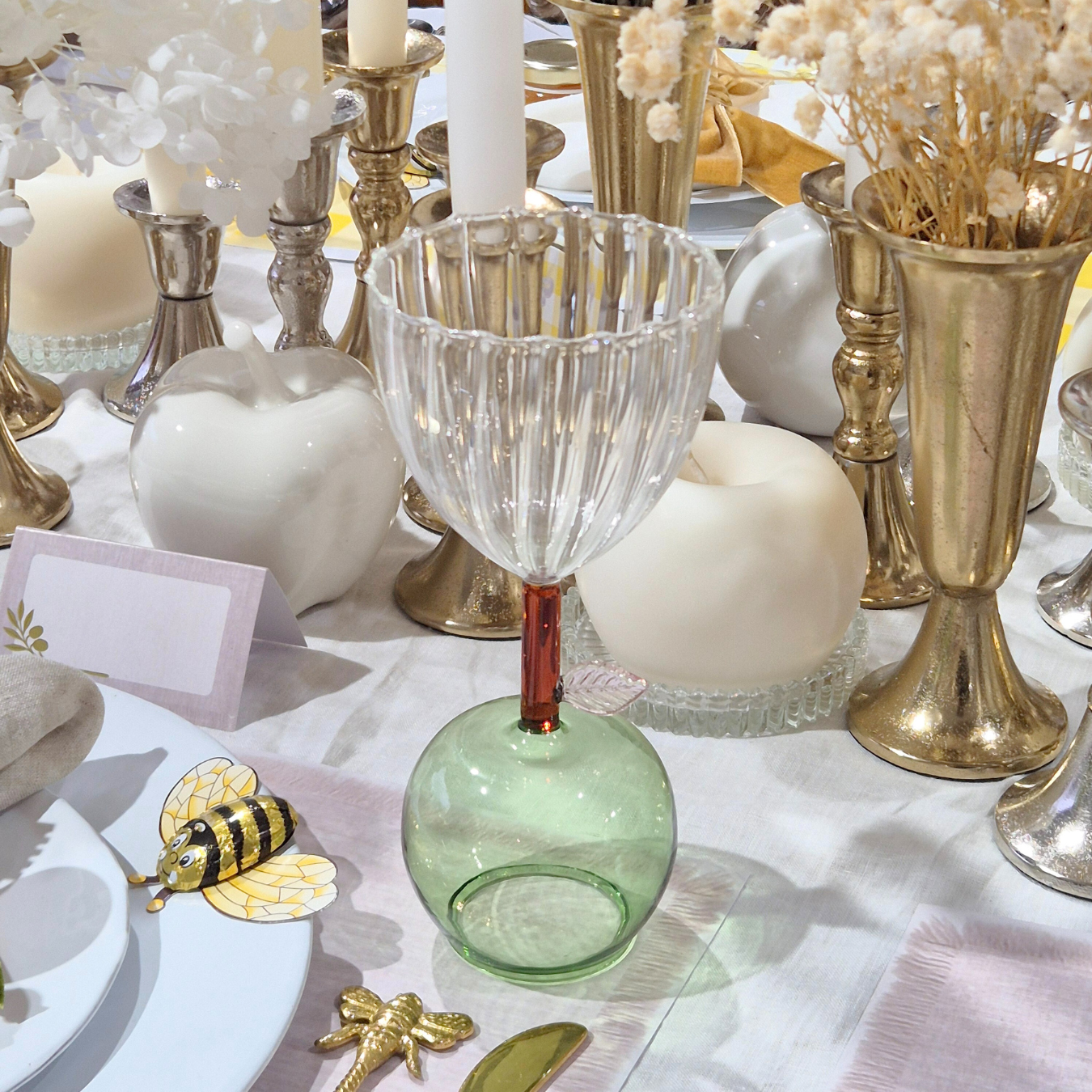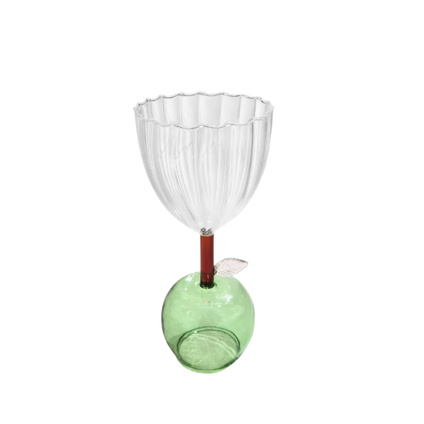 Enhance your Rosh Hashanah table setting with this exquisite Apple-Themed Glass Goblet, a perfect blend of elegance and tradition. The goblet features a delicately crafted clear glass vessel with a scalloped edge. Its unique base, shaped like an apple with a charming green leaf detail, adds a festive touch, embodying the spirit of the holiday. Ideal for serving any beverage during your holiday meal, this goblet is a functional piece that will elevate your celebration. Make your Rosh Hashanah gathering even more special with this beautiful addition to your tableware collection.