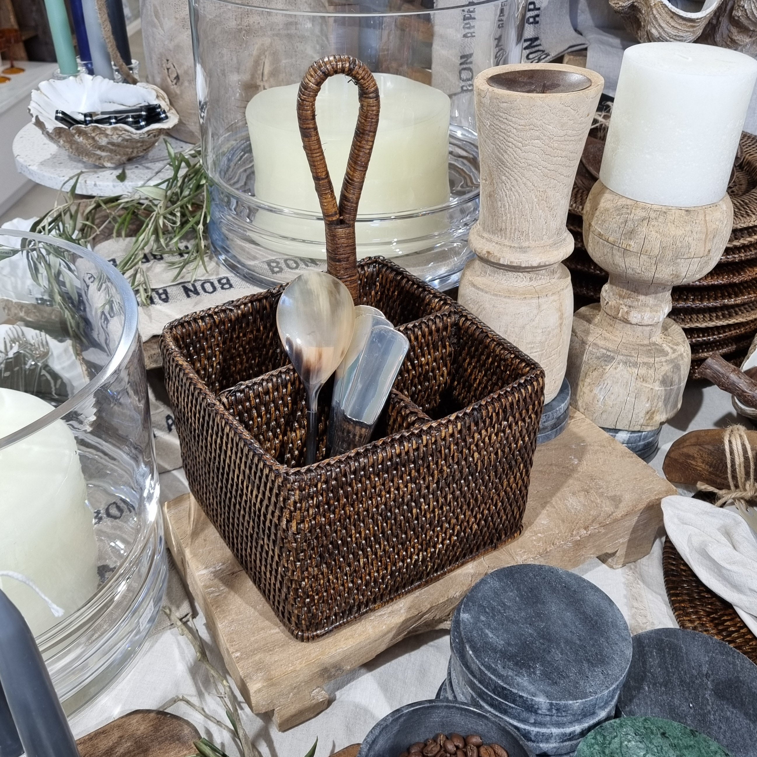 The stylish rattan deep cutlery caddy is perfect to carry utensils, napkins and even condiments to the table.