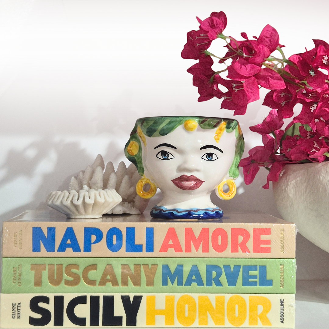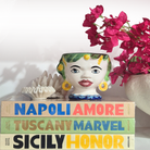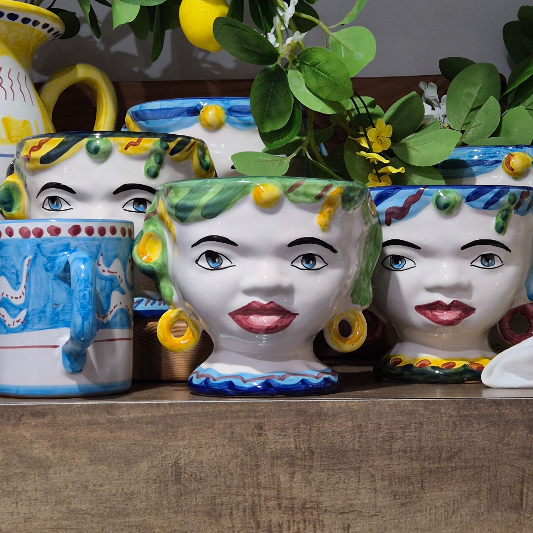 A beautifully hand-painted Italian Moro head crafted in the Amalfi Coast. Rich in colour and expressive detail, this traditional Sicilian-inspired piece serves as a striking vase for fresh or dried flowers. A bold statement of Mediterranean artistry for any home.