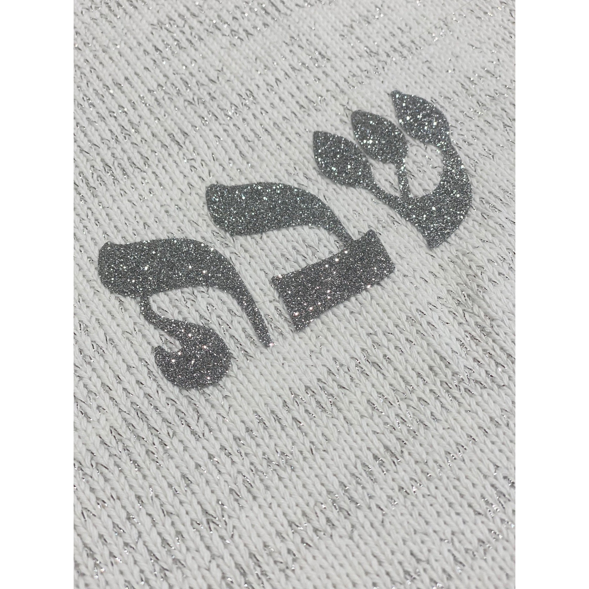 Glitter silver writing against a white backfround with silver thread