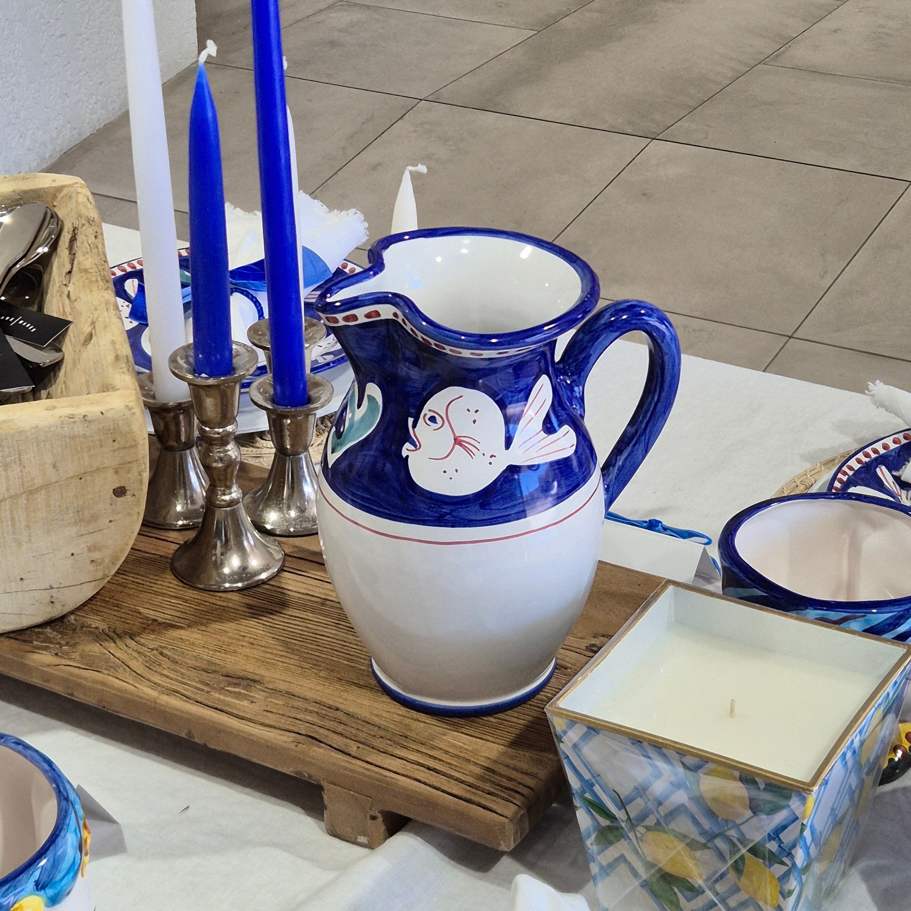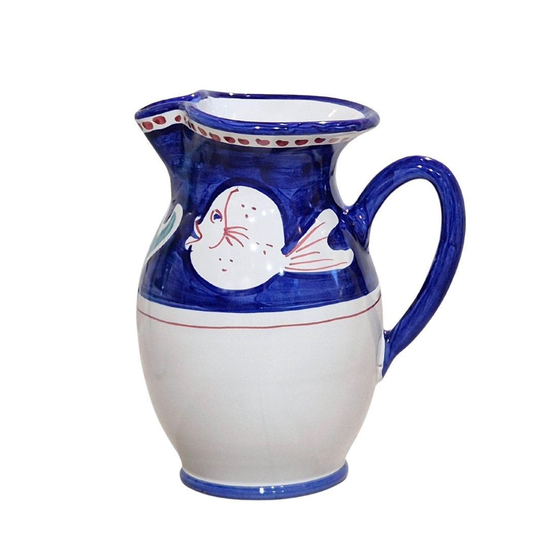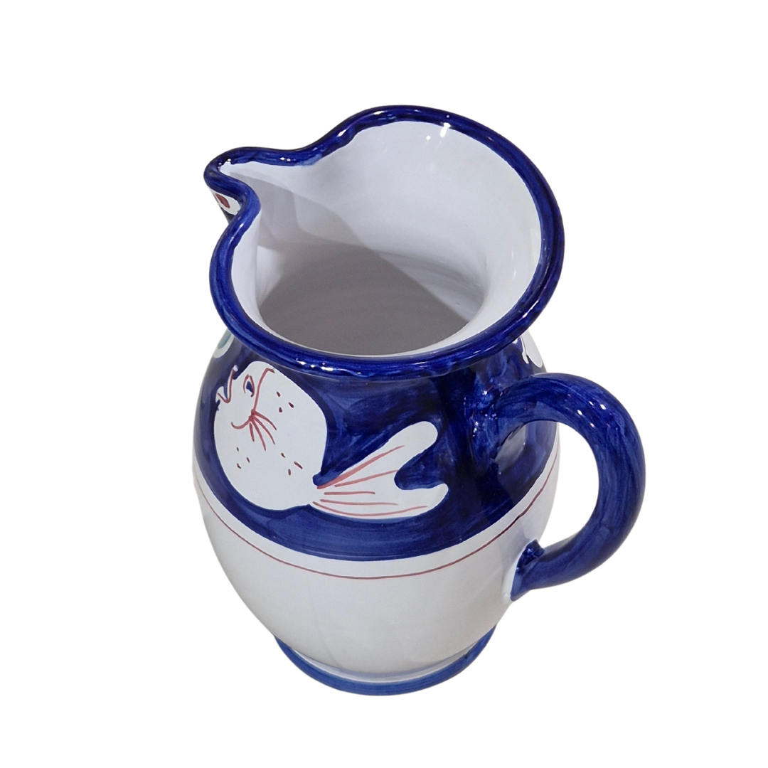 A hand-painted Italian jug featuring a navy blue palette with charming fish motifs. Perfect for serving any beverage or displaying seasonal blooms, it brings a warm Mediterranean touch to everyday dining. Crafted with artisanal care in Italy.