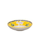 A vibrant hand-painted Italian pasta bowl featuring a sunny yellow backdrop, playful animal motifs, and deep blue accents. Perfect for pasta, salads, or hearty servings, it brings a cheerful Mediterranean touch to every meal. Crafted with artisanal care in Italy.