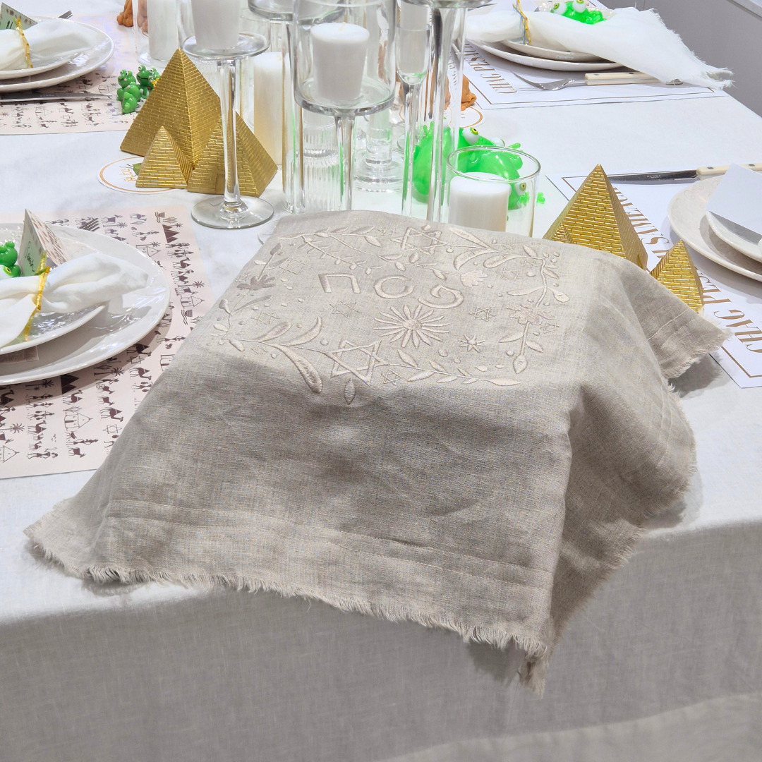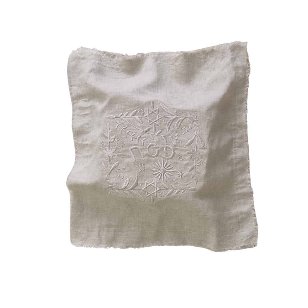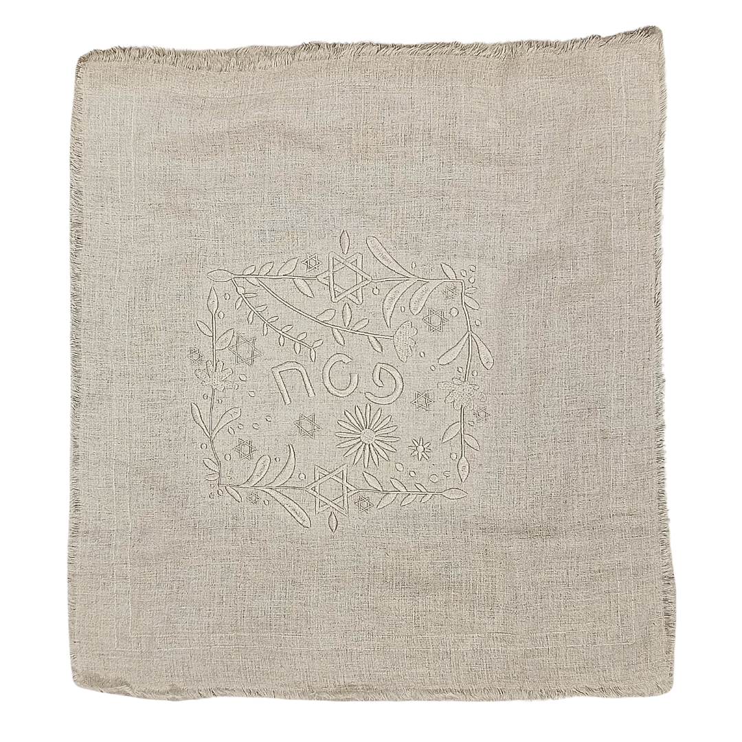 Linen Matzah Cover | Natural w/ Natural Embroidery | 3 Pockets