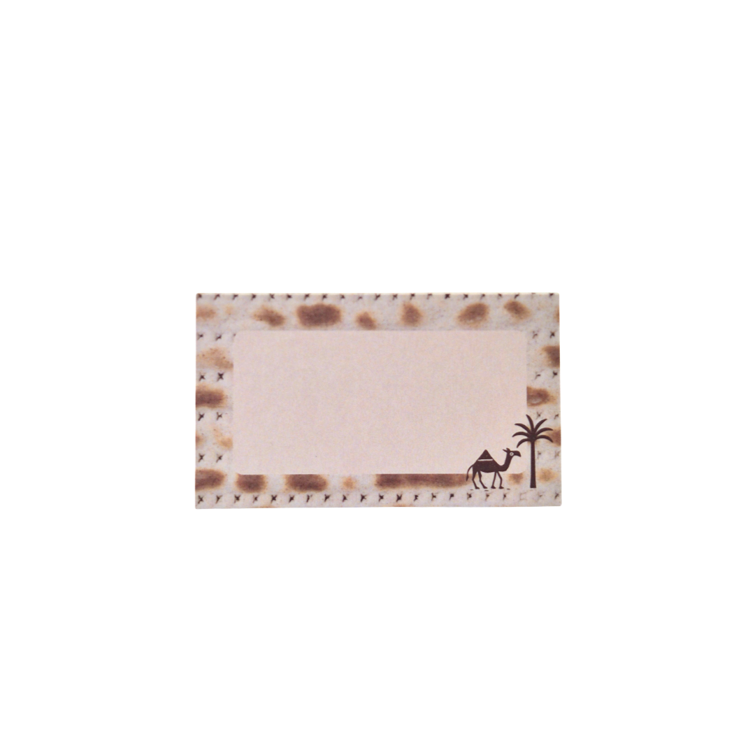 With the background of a matzah, in the front there is clear space for the names of your guests with an elegant drawing of a camel and a palm tree, and in the back the Hebrew writing for a happy Passover: