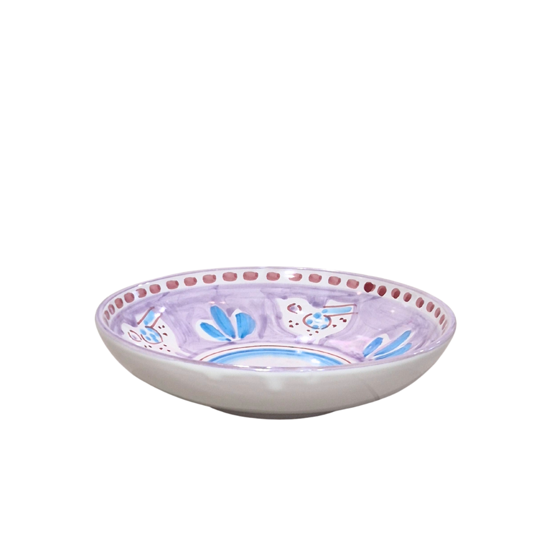A charming hand-painted Italian pasta bowl featuring soft lilac tones, playful bird motifs, and vibrant blue accents. Perfect for pasta, salads, or generous servings, it brings a delicate Mediterranean touch to any table. Crafted in Italy with artisanal detail.