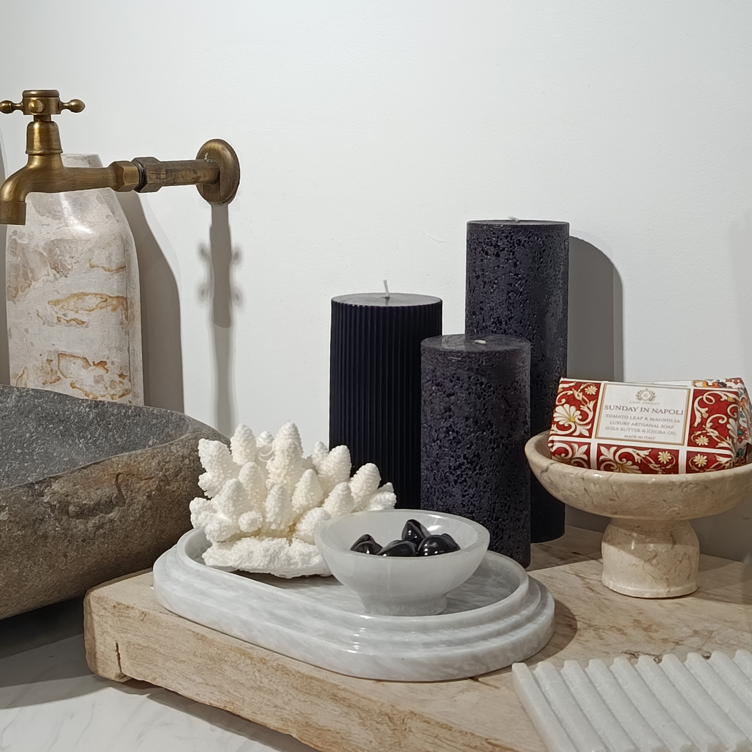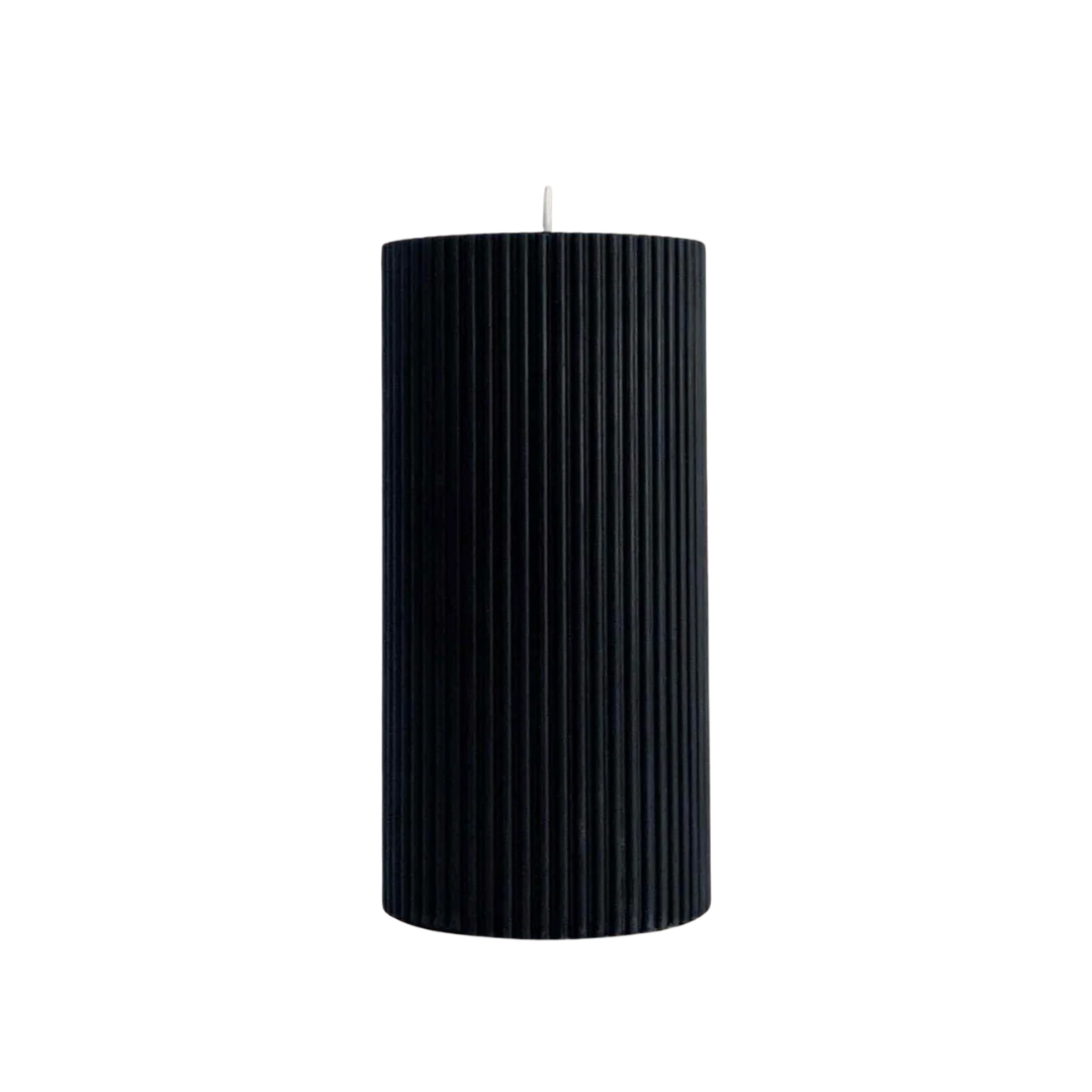 A black ripple pillar candle, inspired by the endless ridges of the sandy ocean floor, and the ripples of the sea itself. Elevate your dining experience with this fragrance-free pillar candle, or use it as a design object to style your home.
