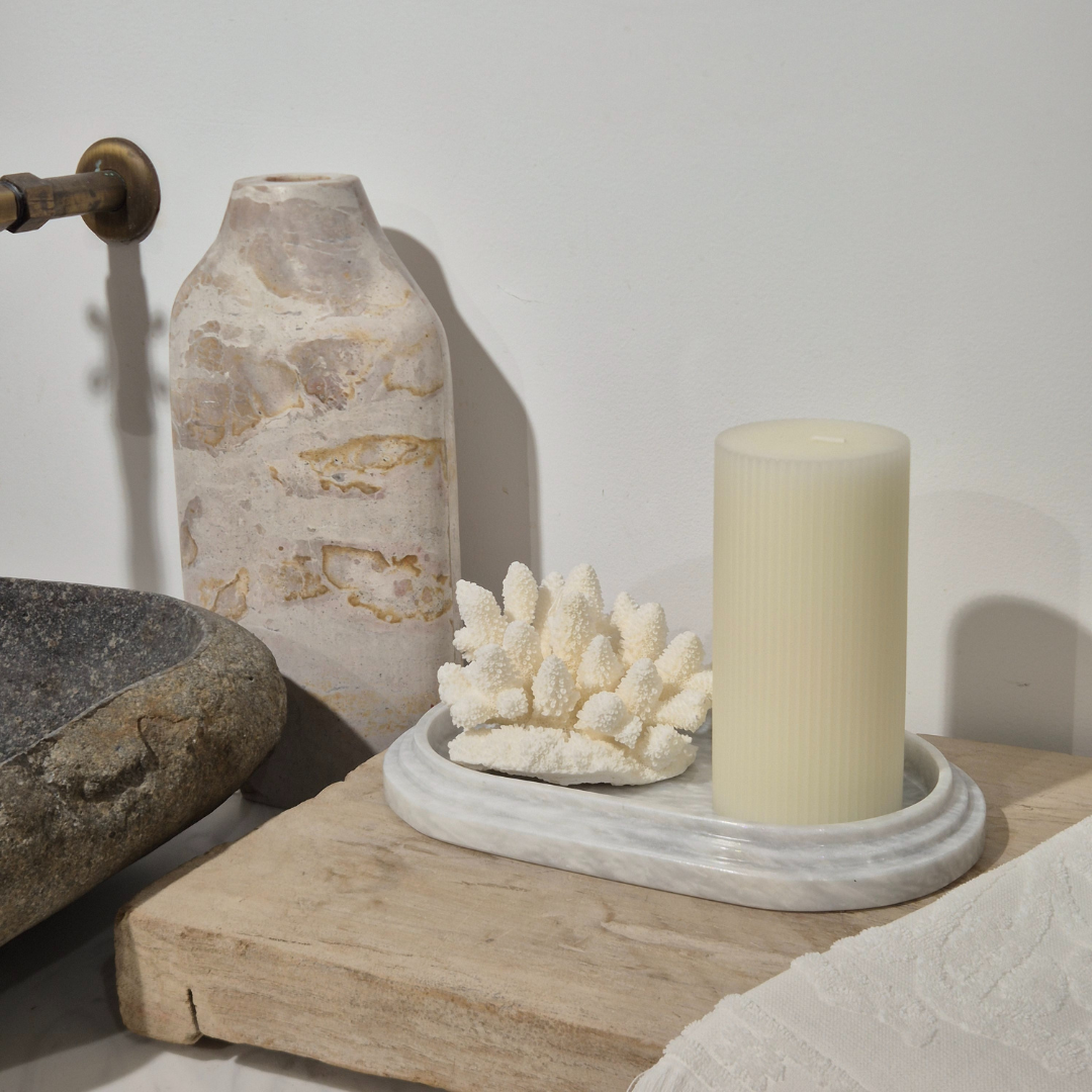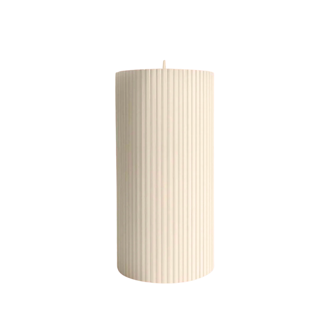 A striking warm white ripple pillar candle, inspired by the endless ridges of the sandy ocean floor, and the ripples of the sea itself. Elevate your dining experience with this fragrance-free pillar candle, or use it as a design object to style your home.