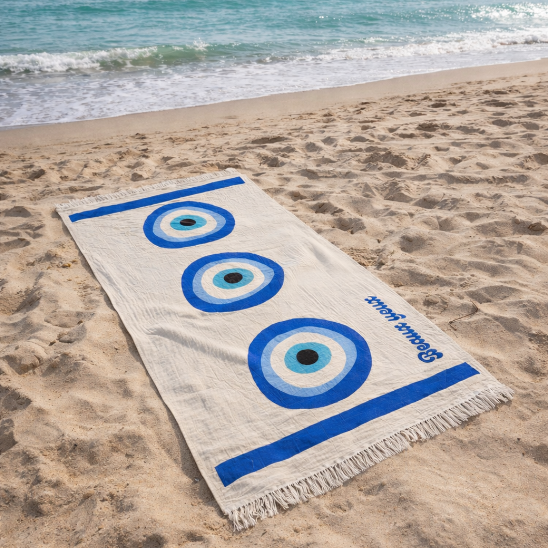 Channel timeless design and serene style with our Summer 2026 evil eye beach towel. Featuring a trio of stylized evil eye motifs in concentric shades of blue, white, and black, the pattern blends cultural references with clean, modern minimalism. The phrase Beaux Yeux (“beautiful eyes” in French) adds a soft, elegant touch to the overall look.