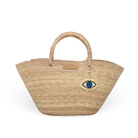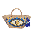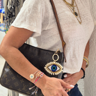 THE Evil Eye accessory perfect as a bag charm or as a key ring. Graphic, bold, and beautifully made. This charm reimagines the classic evil eye motif with clean lines and tactile beadwork. The palette--white, black, blue, and green--feels fresh and versatile. A statement detail that elevates any bag or key set.