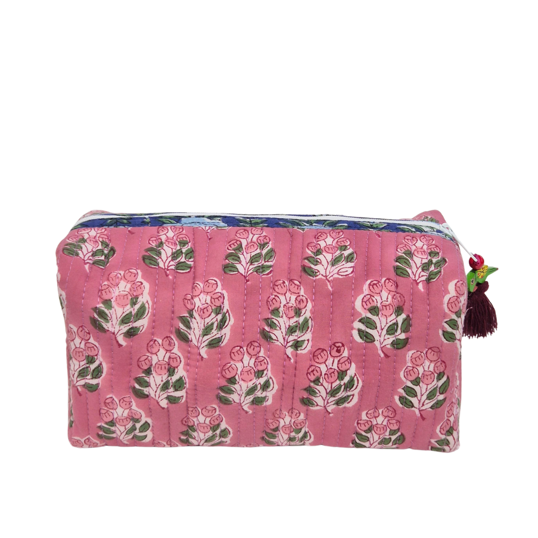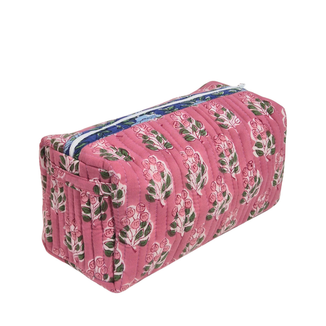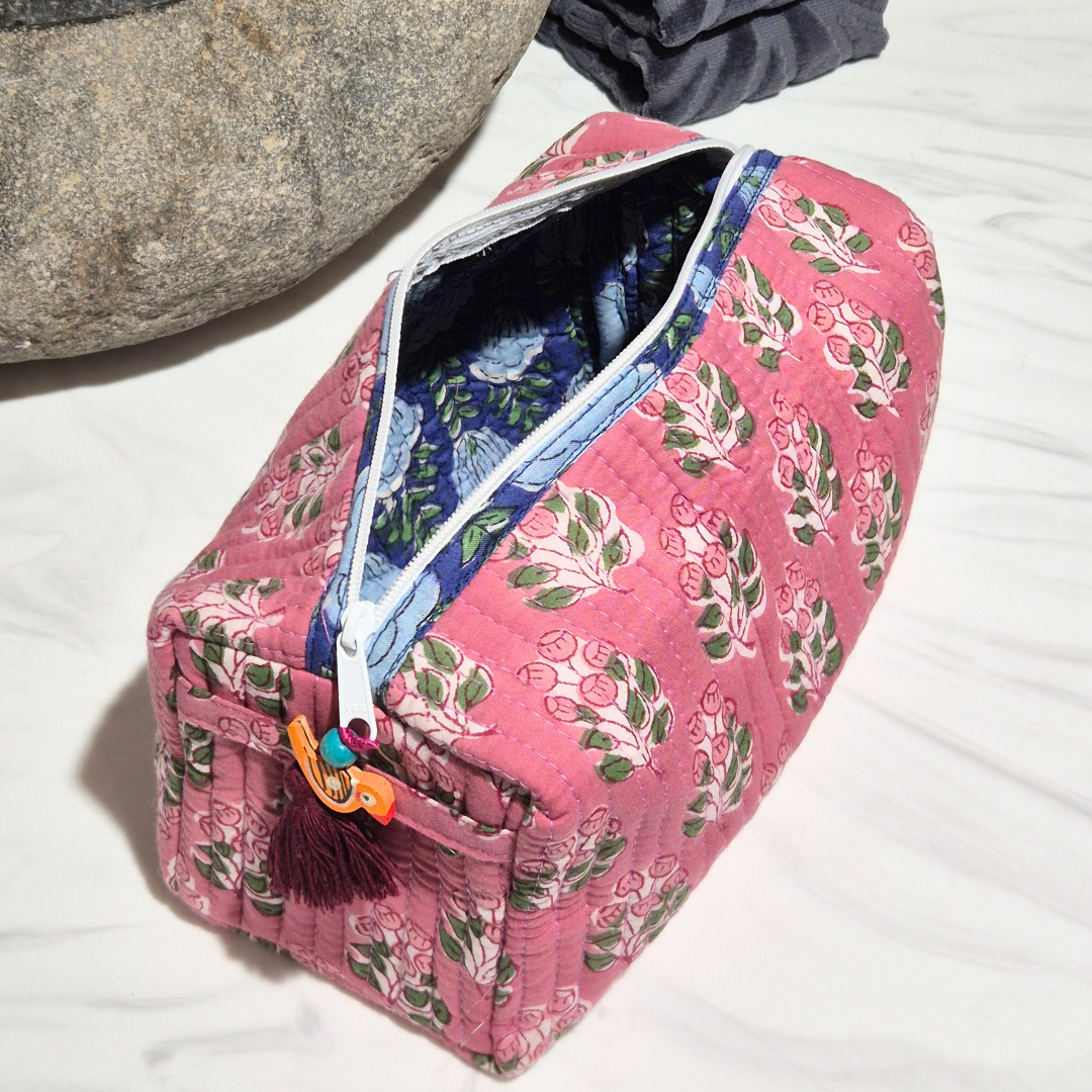 Crafted from soft organic cotton, this quilted toiletry/cosmetic bag features a charming block-printed floral design, bringing a touch of artisanal elegance to your daily and travel routine. Handmade in India, it combines eco-friendly materials with timeless style, making it the perfect companion for organizing your cosmetics and travel essentials while supporting sustainable craftsmanship.