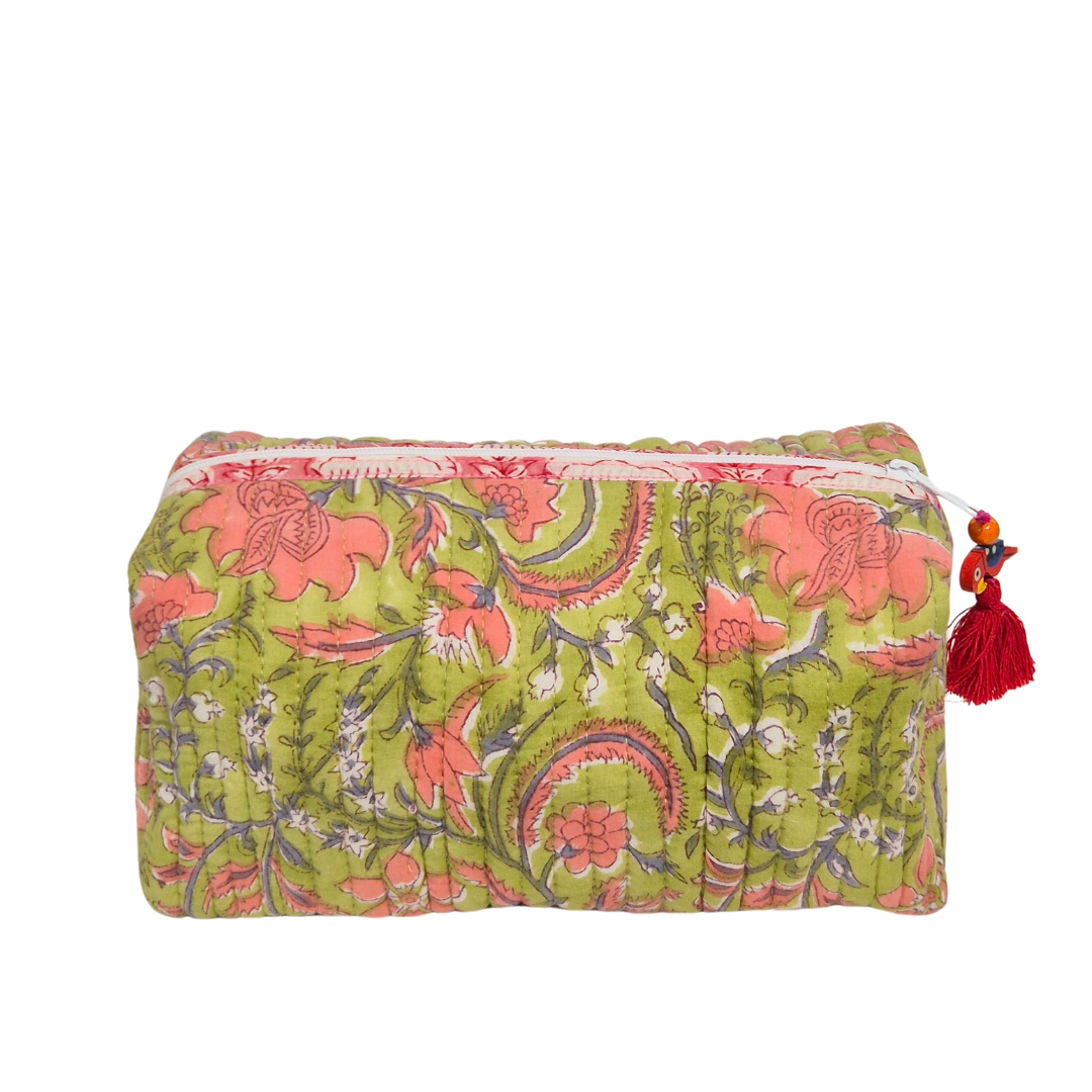 Crafted from soft organic cotton, this quilted toiletry/cosmetic bag features a charming block-printed floral design, bringing a touch of artisanal elegance to your daily and travel routine. Handmade in India, it combines eco-friendly materials with timeless style, making it the perfect companion for organizing your cosmetics and travel essentials while supporting sustainable craftsmanship.